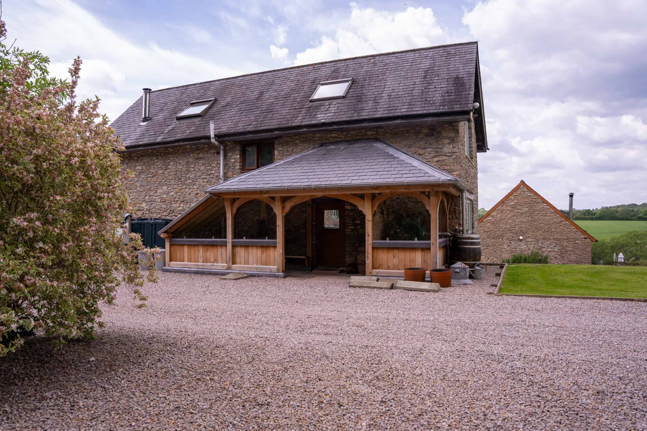 The frame has had time to settle in! This porch framed in oak and glazed has changed its’ colour tone over the past 18 months. Its warm hue blends and harmonises perfectly with the original stone building.